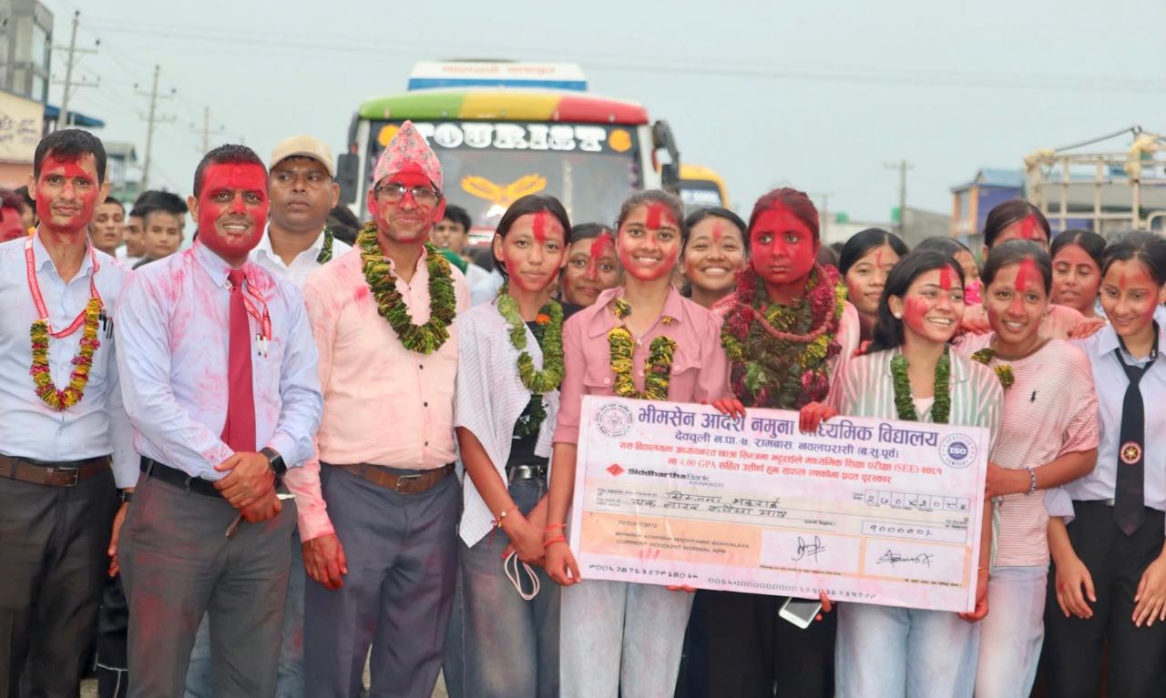 विद्यालयले आयोजना गरेको विद्यार्थी सम्मान कार्यक्रम पुगेका देवचुली नगरपालिकाका नगर प्रमुख हरिप्रसाद न्यौपानेले भीमसेनको नतिजाले पालिकाको नै गौरव बढाएको बताए । देवचुलीमा एसईई २०८१ मा ४ जीपीए ल्याउने ५ जना विद्यार्थी भएको र भट्टराईलाई नगरपालिकाले समेत सम्मान गर्ने नगर प्रमुख न्यौपानेले बताए । ` पालिकाको हरेक शैक्षिक गतिविधिमा भीमसेनको नतिजा उत्कृष्ट रहेको छ, अझै सफलता पाउने गरि अगाडि बढनका लागि शुभकामना छ,´ उनले भने ।