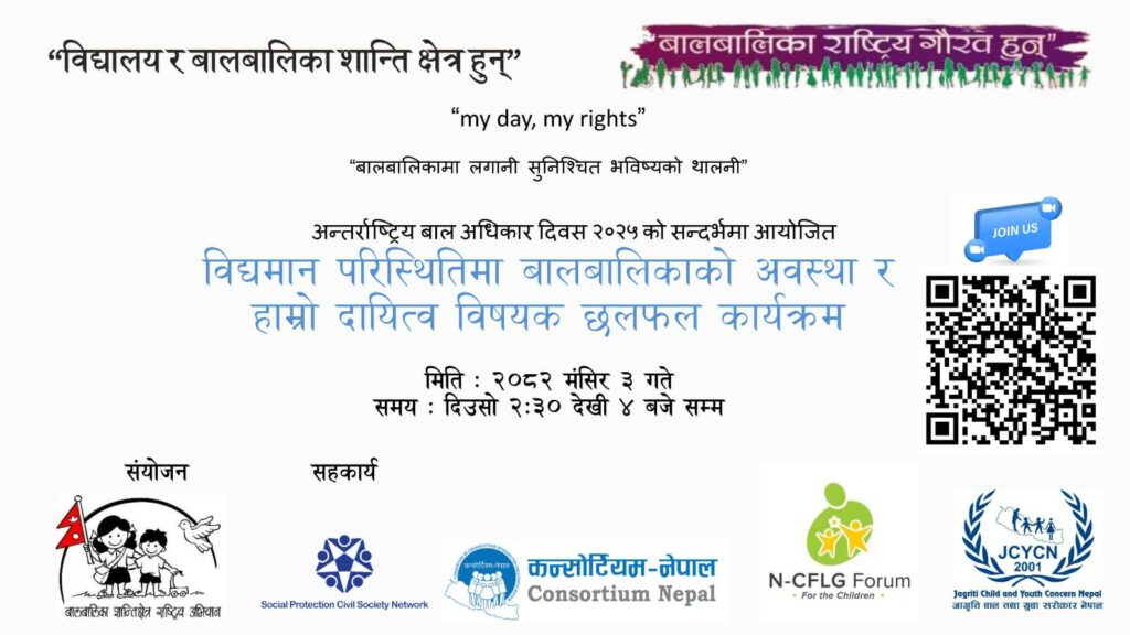 काठमाडौं । अन्तर्राष्ट्रिय बाल अधिकार दिवस २०२५ को अवसरमा मेरो दिन मेरो अधिकार भन्ने अन्तर्राष्ट्रिय नारा र बालबालिकाको लागि लगानी सुनिश्चित भविष्यको थालनी भन्ने राष्ट्रिय नाराका साथ देशभरि विभिन्न कार्यक्रमका साथ प्रत्येक वर्ष नोभेम्बर २० को दिन मनाइँदै आएको छ। यसै सन्दर्भमा बालबालिका शान्ति क्षेत्र राष्ट्रिय अभियानको संयोजनमा कन्सोर्टियम नेपाल,सामाजिक सुरक्षा नागरिक समाज सञ्जाल,बालमैत्री स्थानीय शासन राष्ट्रिय मञ्च र जागृति बाल तथा युवा सरोकार नेपालको सहकार्यमा बालबालिकाको विद्यमान अवस्था र हाम्रो दायित्व विषयक छलफल बुधबार सम्पन्न गरिएको हो । कार्यक्रममा ५० जिल्लाका ११४ जनाको सहभागितामा जुमको माध्यमबाट रहेको थियो ।