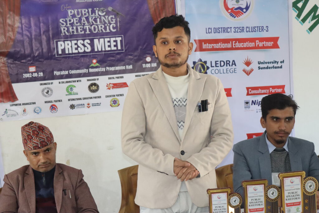 नवलपुर । सरल नेपालले राष्ट्रियस्तरको ‘अनलाइन सार्वजनिक वक्तृत्वकला प्रतियोगिता आयोजना गर्ने भएको छ। प्रतियोगिताबारे आइतबार पिप्रहर सामुदायिक होमस्टेमा आयोजित पत्रकार सम्मेलनमार्फत जानकारी गराइएको हो। ‘युवा बोले राष्ट्र बोल्छ’ भन्ने दृष्टिकोण तथा ‘स्पष्ट, आत्मविश्वासी र जिम्मेवार युवा पुस्ता उत्पादन गर्ने राष्ट्रिय अभियान’ भन्ने उद्देश्यका साथ आयोजना गर्न लागिएको प्रतियोगिताको लायन्स क्लब ३२५ आर, क्लस्टर ३ प्रस्तुतिमा मंसिर २९ गतेबाट सञ्चालन हुनेछ ।