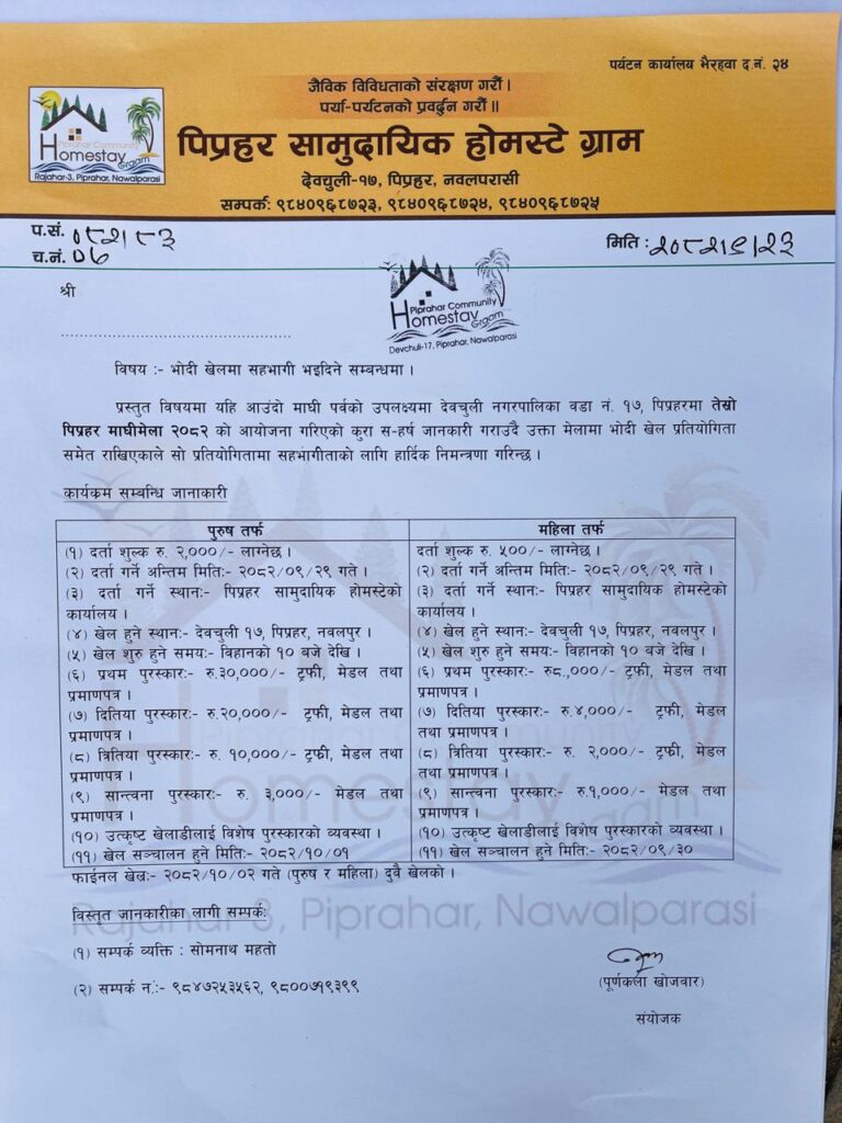देवचुली । देवचुली नगरपालिका वडा नम्बर १७ संचालन हुन लागेको तेस्रो पिप्रहर माघी मेलामा भोदी खेल प्रतियोगिता हुने भएको छ । माघी पर्वको अवसरम पिप्रहर सामुदायिक होमस्टे ग्रामको आयोजनामा पौष ३० गतेबाट माघ २ गतेसम्म संचालन हुन लागेको माघी मेलामा पुरुष तथा महिला भोदी खेल प्रतियोगिता हुने भएको हो ।