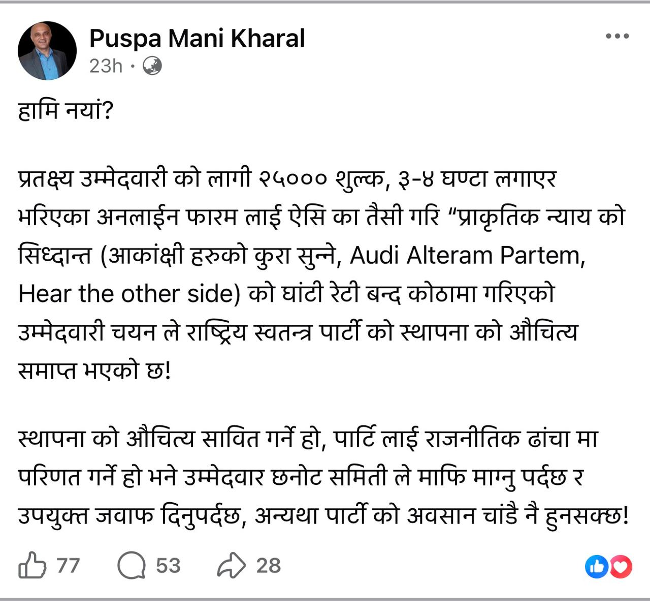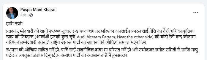 प्रतक्ष्य उम्मेदवारी को लागी २५००० शुल्क, ३-४ घण्टा लगाएर भरिएका अनलाईन फारम लाई ऐसि का तैसी गरि “प्राकृतिक न्याय को सिध्दान्त (आकांक्षी हरुको कुरा सुन्ने, Audi Alteram Partem, Hear the other side) को घांटी रेटी बन्द कोठामा गरिएको उम्मेदवारी चयन ले राष्ट्रिय स्वतन्त्र पार्टी को स्थापना को औचित्य समाप्त भएको छ!