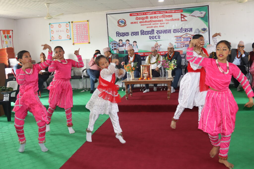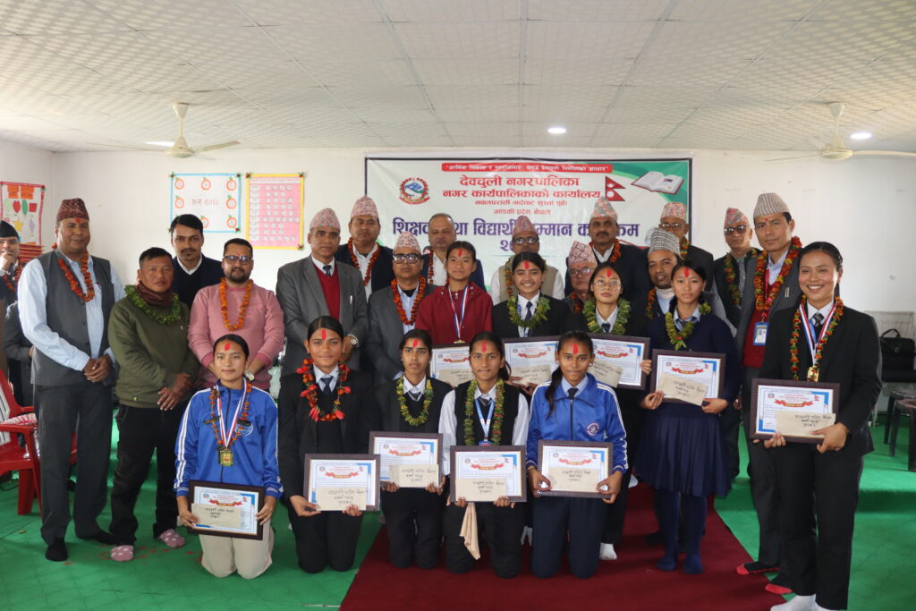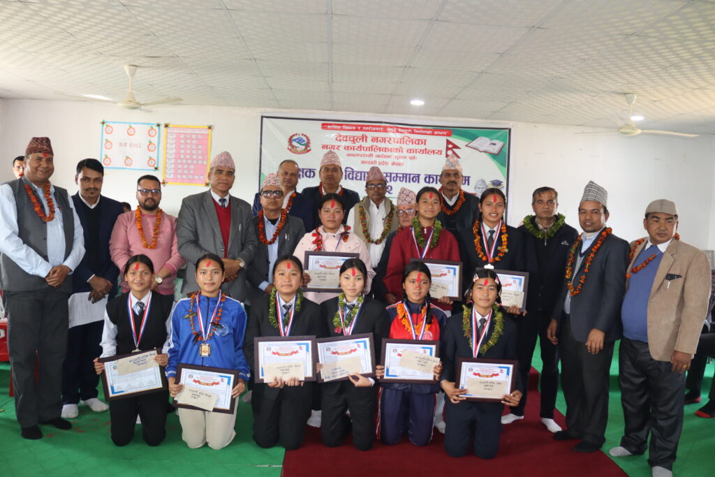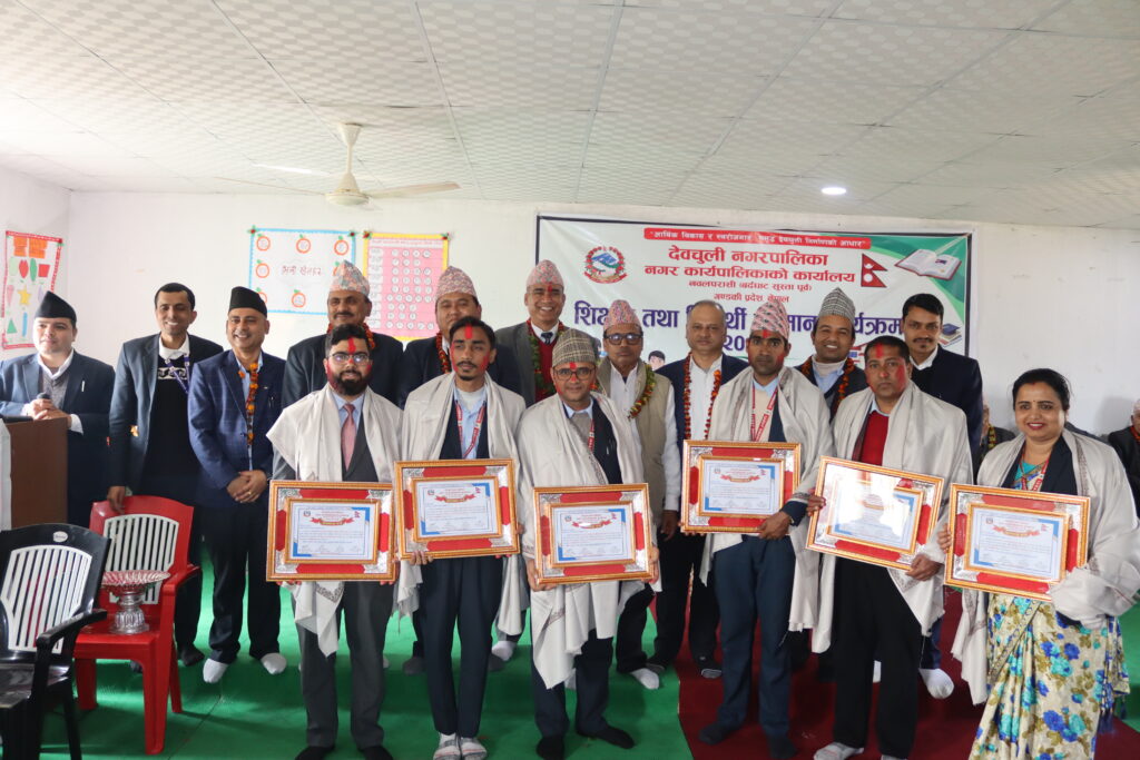 देवचुली। देवचुली नगरपालिकाद्वारा शिक्षक तथा विद्यार्थीहरु सम्मानित गरिएको छ । कक्षा ५ को परीक्षा २०८१,कक्षा ८ को आधारभूत तह उतीर्ण परीक्षा २०८१ र एस ई ई २०८१ का उत्कृष्ट विद्यार्थी सम्मान,कक्षा १२ को उत्कृष्ट विद्यार्थी सम्मान,उत्कृष्ट क्षमता भएका विद्यार्थी सम्मान, अतिरिक्त क्रियाकलापमा उत्कृष्ट विद्यार्थी सम्मान, विषयगत शिक्षक सम्मान, सर्वोकृष्ट लेखापाल, कर्मचारी तथा बाल विकास सहजकर्ता सम्मान र तहगत उत्कृष्ट विद्यालय सम्मान गरिएको हो।